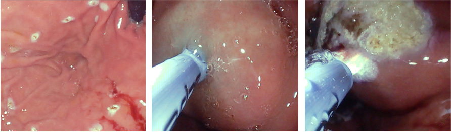 Der markierte Bereich wird mittels einer nadelfreien Hochdruckinjektion mit Kochsalzlösung unterspritzt und anschließend durch Argonplasma-Koagulation (APC) devitalisiert. Diese beiden Schritte werden so lange wiederholt, bis der gesamte Bereich abladiert ist.